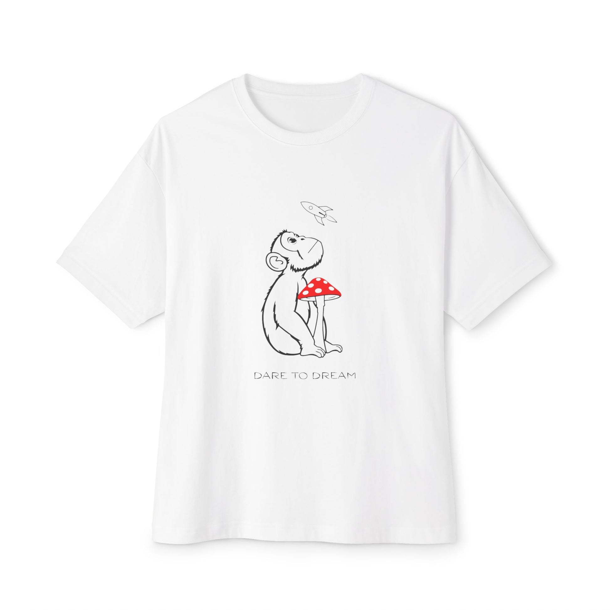 Soft, roomy, and quietly imaginative — this oversized boxy tee carries a gentle story on its chest. A small, sketch-style chimp sits contentedly with a bright red mushroom, gazing skyward as it dreams of an airplane, capturing a moment of wonder and curiosity.